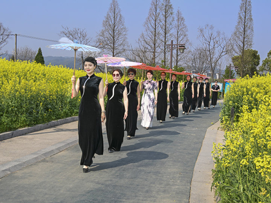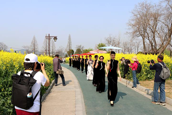只見形體走秀班的學員們身著旗袍,在花海間邁著優雅的步伐。她們身姿婀娜,一顰一笑、舉手投足間盡顯自信風采,與爛漫春光相互交融,構成了一道道亮麗的風景線。攝影班學員們則穿梭其中,全神貫注地用手中相機定格美好瞬間。為了讓攝影班學員們有更多的拍攝素材與獨特視角,授課教師陳定根更是別出心裁,將自己的烏篷船劃到河邊。在悠悠的烏篷船上,陳老師一邊親身示范,一邊為學員們講解如何拍攝水鄉特色與人物景致融合的照片,讓學員們近距離領略“小橋流水人家”的江南韻味。