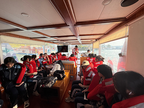 首站抵達湖濱碼頭,師生們乘游船前往圓融廣場。碧波蕩漾的湖面上,23導游中高班的“小導游”們化身文化使者,沿途生動講解東錢湖的歷史淵源、人文、自然風光故事。同學們認真聆聽,時而提問記錄,在沉浸式體驗中深化了對家鄉水域文化的理解。