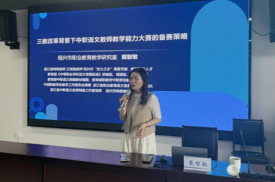 紹興市職成教教研員戴智敏老師分享“三教改革背景下中職語文教師教學能力大賽的備賽策略”,她建議老師們既要仰望天空又要腳踏實地,要在了解國家層面大政方針與教學改革的關系下和立足語文教學、學會打破單篇教學,大情景下構建多篇專題教。講座內容給老師們今后的參賽指明了方向。