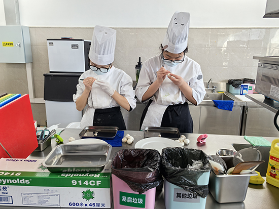 自接到參賽通知起,該校西式烹飪團(tuán)隊(duì)的莫琳和羅莎莎同學(xué),中式烹飪團(tuán)隊(duì)的沈以欣、劉云鵬和韓思源同學(xué)在教練團(tuán)隊(duì)的帶領(lǐng)下,開啟了緊張有序的備賽訓(xùn)練。全體隊(duì)員和指導(dǎo)教師始終保持高度責(zé)任感與精益求精的態(tài)度,從清晨到深夜,全身心投入到高強(qiáng)度訓(xùn)練中。訓(xùn)練期間,每個(gè)環(huán)節(jié)都力求極致:原料選擇、工藝設(shè)計(jì)、單一模塊打磨以及整體搭配協(xié)調(diào)性均融入創(chuàng)新元素,將傳統(tǒng)與現(xiàn)代完美結(jié)合。“中式烹飪”尤其注重刀工精細(xì)度、火候掌控力及擺盤美感,經(jīng)過反復(fù)推敲與打磨,確保每道菜品展現(xiàn)最佳狀態(tài)。指導(dǎo)教師全程陪伴,不僅提供技術(shù)指導(dǎo),還在心理上給予鼓勵(lì)支持,并通過全真模擬比賽幫助學(xué)生適應(yīng)節(jié)奏與環(huán)境,提升實(shí)戰(zhàn)能力。
