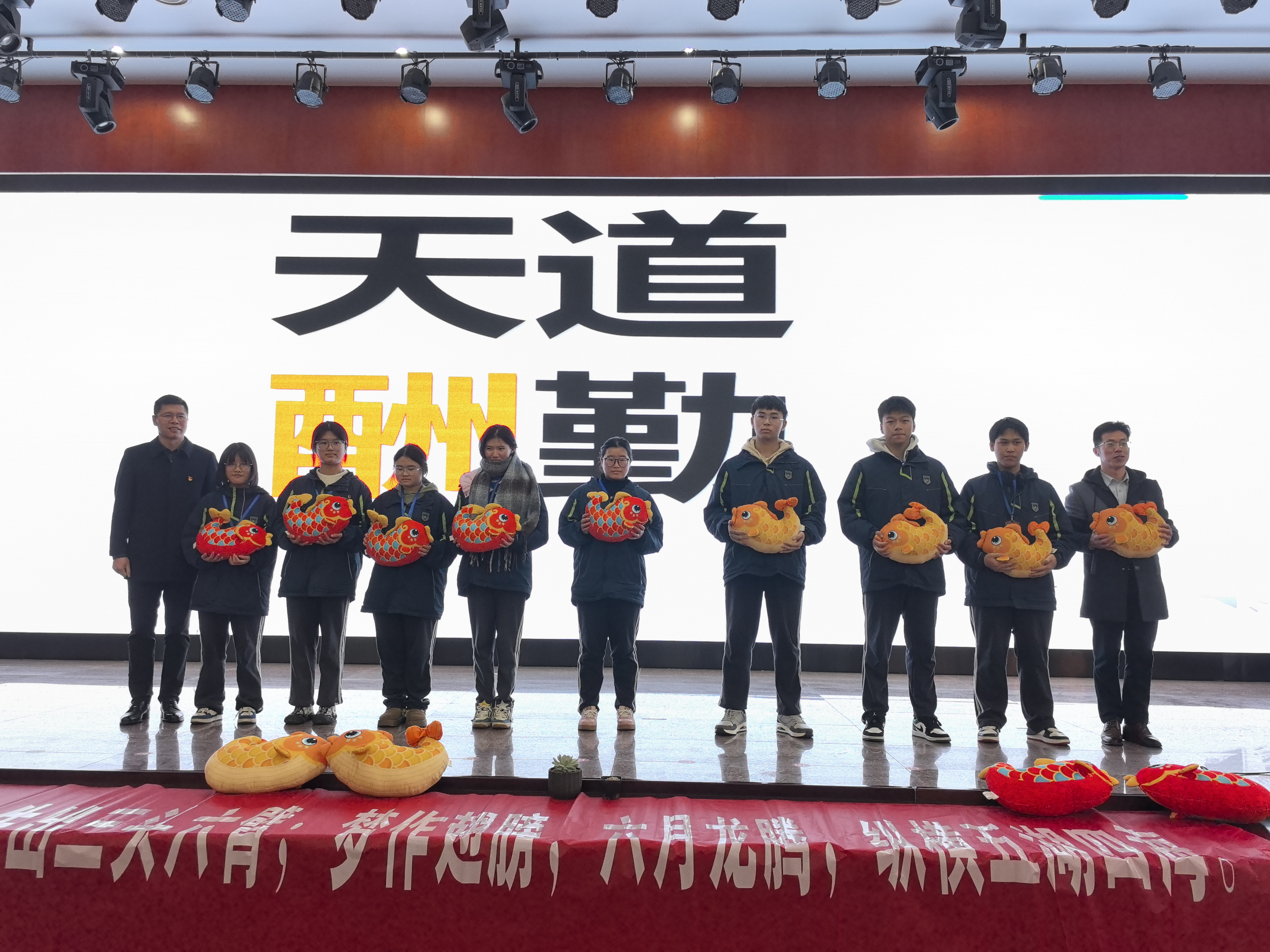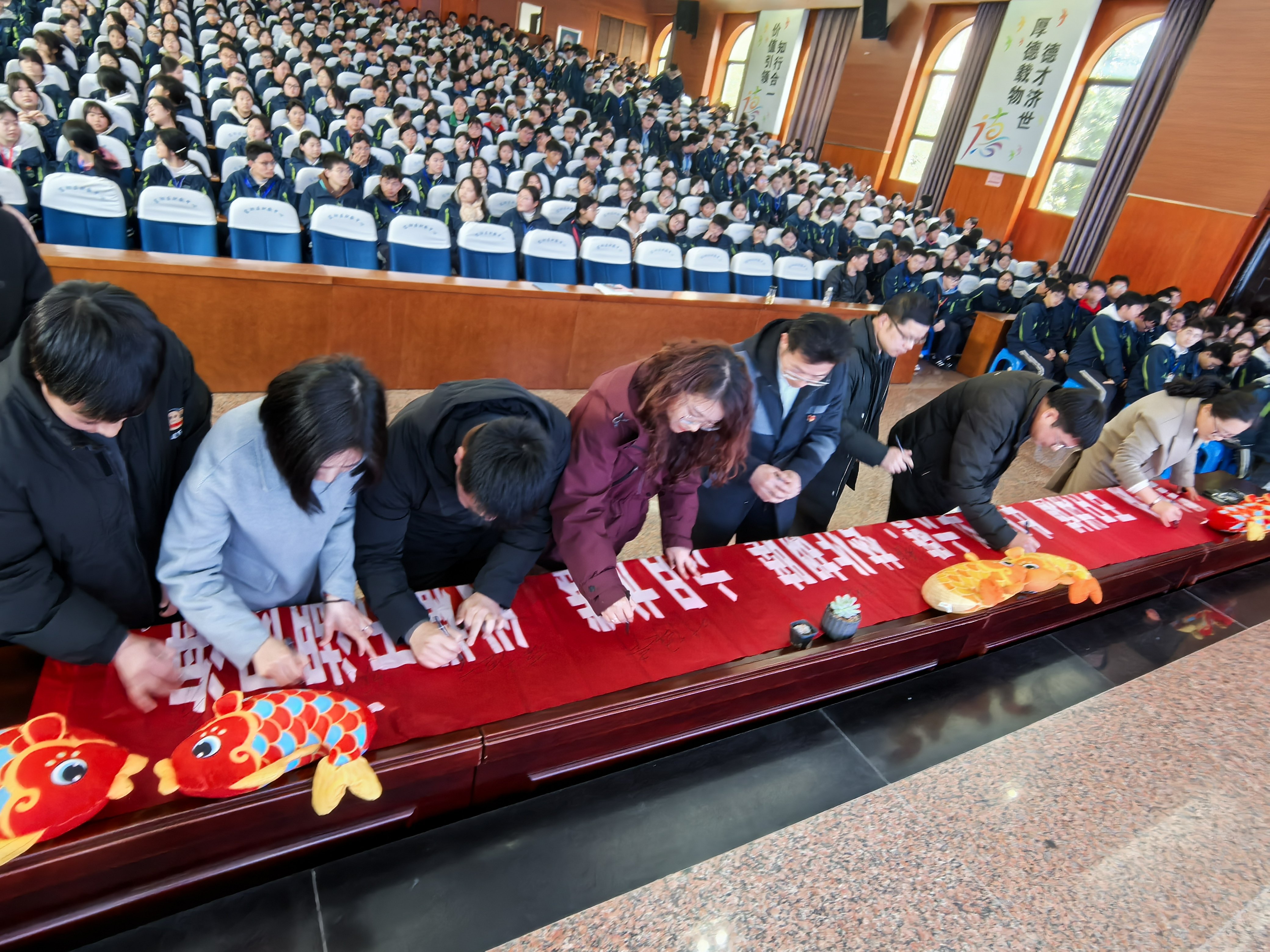接著各專業部部長親自上臺,為同學們送上寓意深遠的“福”字,象征著對學生們的祝福和期待。希望同學們高考必勝,金榜題名。師生們紛紛在橫幅上寫下自己的名字。最后夏峰巍校長帶領全體高三學生進行莊嚴宣誓。誓言聲整齊劃一,響徹整個報告廳。