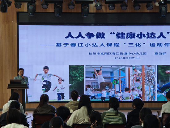 學員們來到了沉靜又美麗的杭州市富陽區春江街道中心幼兒園的中心園區和建設園區,進行了現場觀摩全園混齡“春江小達人”運動大循環活動。園長夏邑群以《人人爭做“健康小達人”——基于春江小達人課程“三化”運動評價的實施》為題,向學員們介紹了“三化”評價體系,借助云端數據動態追蹤兒童成長軌跡,從而打造野趣盎然的體能循環系統。