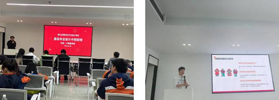 各組學(xué)生代表依次登臺(tái),向評(píng)審團(tuán)詳細(xì)闡述設(shè)計(jì)理念、面料選擇及制作工藝,并展示精心制作的效果圖集。