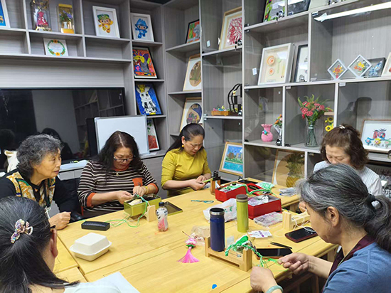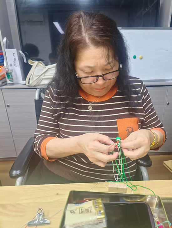 采荷街道社區學?;顒邮依?,一場別開生面的結藝編織課正在進行,興趣相投的老年人圍坐一起結社而學。先將線對折打金剛結,留出合適的長度后穿入轉運珠,再調整繩結的松緊……,社區大先生王老師耐心講解著編織技巧,老人們一邊認真聆聽,一邊反復練習,遇到復雜步驟便互相交流探討,在老師的指導下,手中的線逐漸勾勒出精致的手鏈、戒指,以及惟妙惟肖的小蛇掛飾等手工藝品。