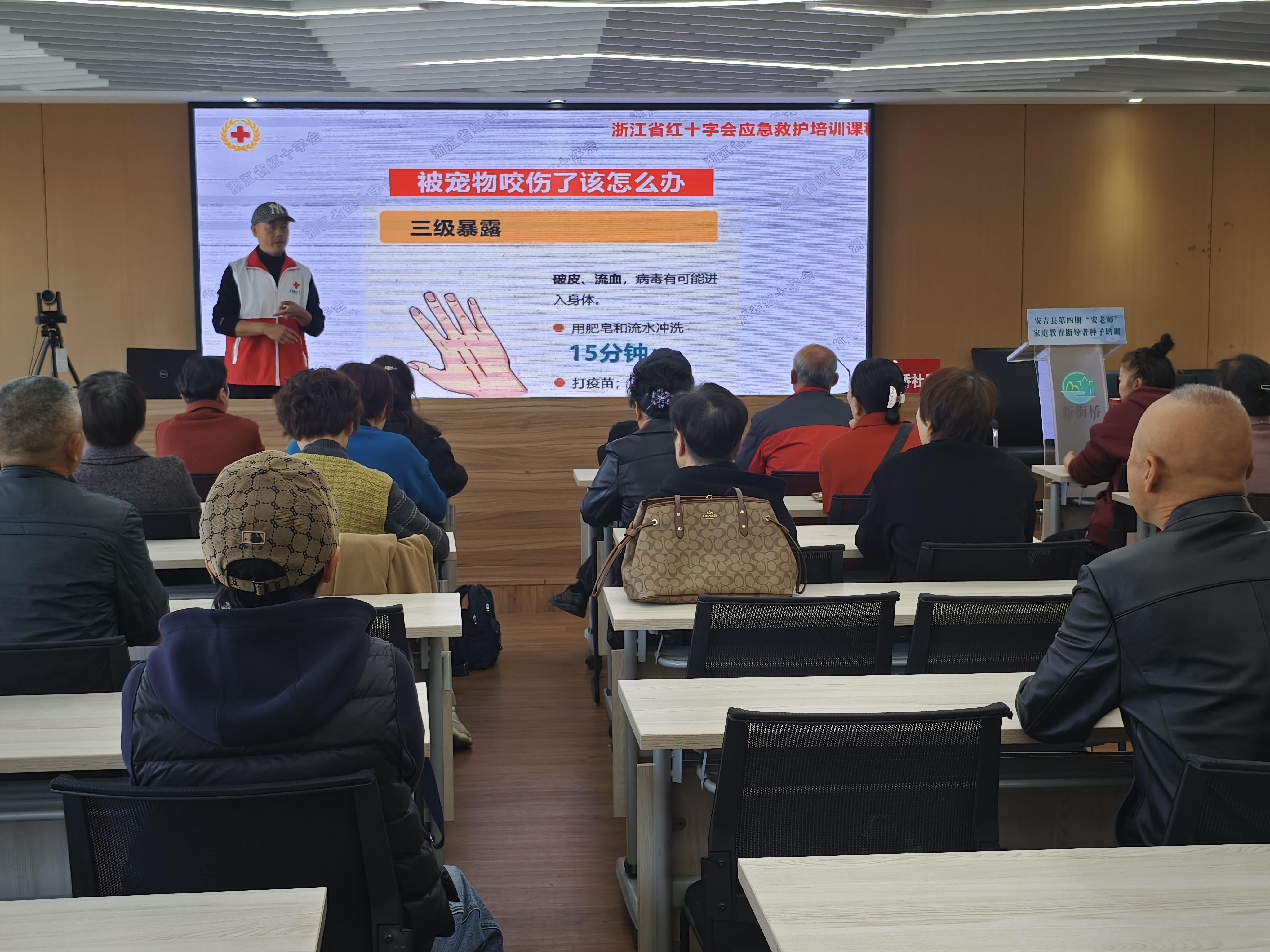 在講座中,丁柏偉老師詳細分析了寵物抓咬傷的幾種常見情況:一是沒破皮也沒出血;二是破皮了但沒有出血;三是破皮了且出血。針對這三種情況,他分別給出了相應的救護措施和注意事項,使在場居民對如何正確處理寵物抓咬傷有了更清晰的認識。