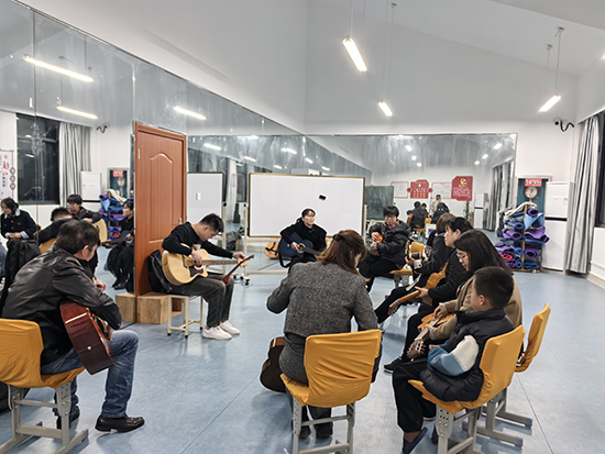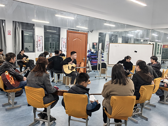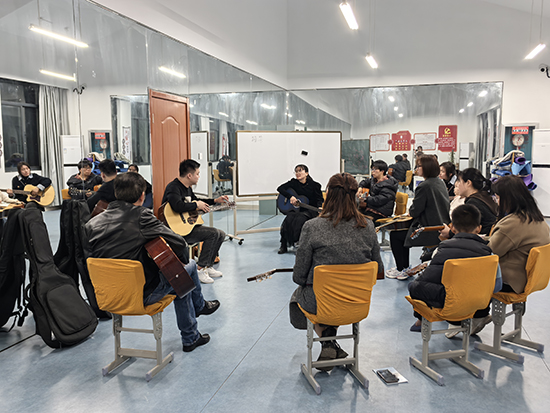 從基礎指法到樂隊合奏的漸進式培養課程設計,充分考慮零基礎學員需求,前四周聚焦《小星星》《生日歌》等簡單曲目,中期引入流行歌曲彈唱,結業時將舉辦學員音樂匯報活動。“我們特意選用37寸旅行吉他,減輕初學者通勤負擔。”作為蘭亭成校“終身學習生態圈”的重要板塊,青藍夜校除吉他課還開設瑜伽爵士舞等課程。