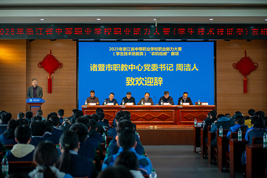 開幕式由該校校長劉柏炎主持,浙江省教育廳職成教教研室張建國、麗水職業技術學院林業科技學院黨總支書記應俊輝、紹興市職業教育教學研究室主任孫堅東、諸暨市教體局副局長沈寶偉及諸暨市職教中心黨委書記周潔人等領導出席并致辭。周潔人強調,賽事立足農業強國戰略需求,旨在培養“懂技術、會維修、能創新”的新農人;沈寶偉指出,本次大賽既是檢驗職教改革成果的實踐考場,更是展現新時代工匠精神的競技舞臺。他誠邀各界在參賽之余感受西施故里人文底蘊,預祝選手賽出風采、賽出水平,共同擦亮“諸有優學”金名片。