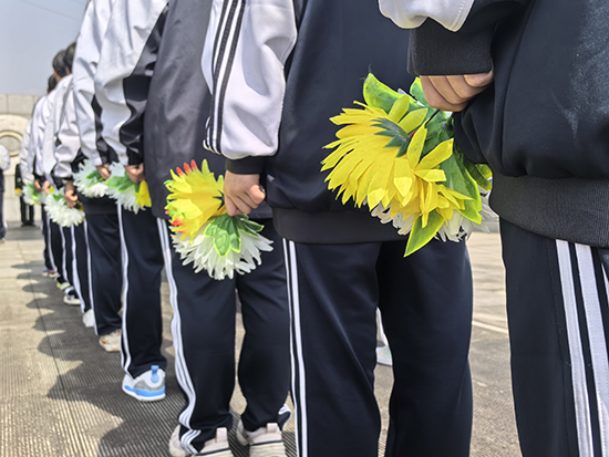 在巍峨的烈士紀念碑前,全體師生肅立整裝,齊唱《義勇軍進行曲》,鏗鏘之聲響徹陵園。隨后,學生代表向烈士敬獻花圈,全體默哀三分鐘,以無聲的追思致敬英雄忠魂。