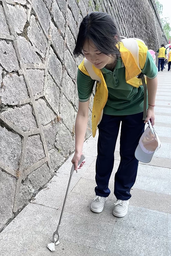 學生們沿著浦陽江游步道前行,隊伍如同一條躍動的長龍,沿途不僅欣賞了美麗的春景,還積極參與環保行動,青益啟志愿者團隊的“環保小分隊”隨手撿拾垃圾,體現了文明出行的理念。
