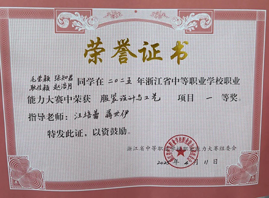 4月9日至11日,2025年浙江省中等職業學校職業能力大賽(學生技術技能類)“服裝設計與工藝”項目比賽在浙江紡織服裝職業技術學院舉行。北侖職高服裝專業代表隊在大賽中憑借精湛的技藝與獨具匠心的設計從眾多參賽隊伍中脫穎而出,一舉斬獲第一名的佳績。