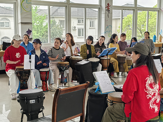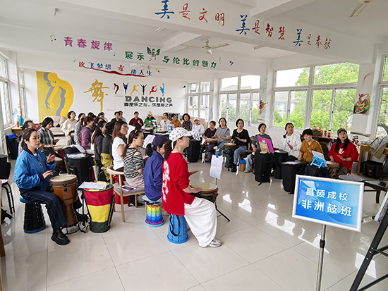 4月12日下午,安吉縣社區(qū)教育學(xué)院昌碩分院(昌碩成校)市民夜校的非洲鼓班迎來了本學(xué)期第三次授課。教室里洋溢著歡快熱烈的氛圍,在專業(yè)老師的指導(dǎo)下,40多名學(xué)員全情投入,用雙手拍打出充滿活力的節(jié)奏。