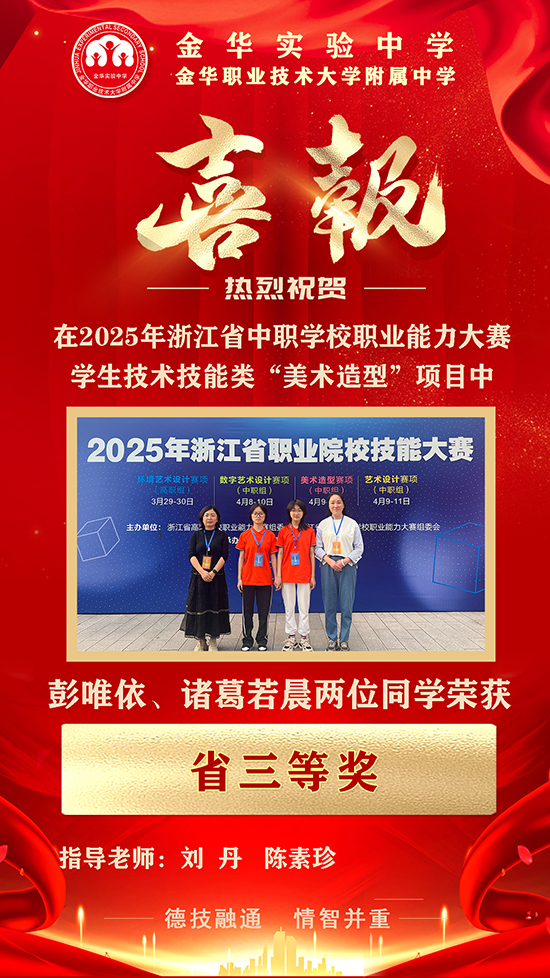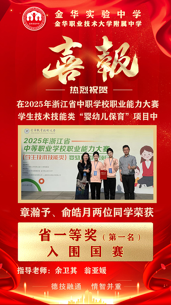 近期,2025年浙江省職業院校技能大賽圓滿落幕,金華實驗中學在多個賽項中斬獲佳績,取得三個省一等獎、一個省三等獎,其中“嬰幼兒保育”“藝術設計”兩大賽項更是奪得第一名,將代表浙江省出征國賽!學校的技能培養與高考升學成績持續領跑同類學校,彰顯“雙線并進”的育人實力。