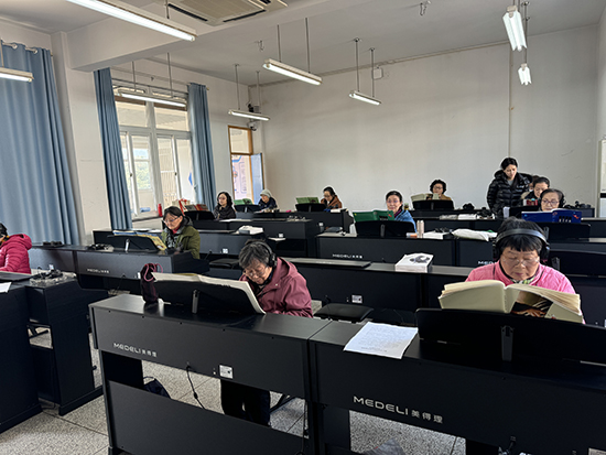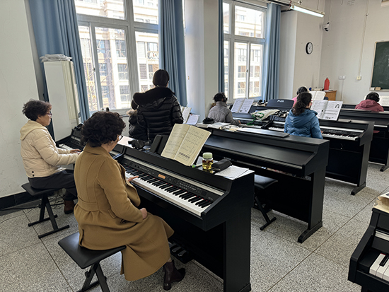 開課當日,教室里洋溢著歡快的氛圍,黃老師從認識琴鍵開始到簡單的指法練習都進行示范演奏,并一對一指導。這群“年輕的老學生”在黑白琴鍵間叩響了屬于他們的幸福樂章。