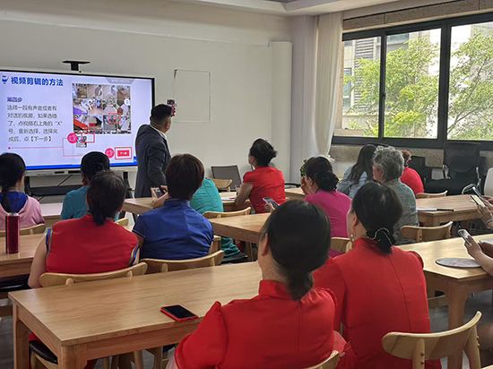 隨后,講師通過(guò)投屏演示抖音剪輯流程,從導(dǎo)入素材、分割片段到添加轉(zhuǎn)場(chǎng)特效步步拆解。阿姨們?cè)谥驹刚呤职咽种笇?dǎo)下,成功將拍攝的素材拼接成連貫視頻,還配上背景音樂(lè)。當(dāng)看到自己編排的走秀片段配上水墨風(fēng)字幕時(shí),她興奮地招呼朋友:“快看,我這‘導(dǎo)演’當(dāng)?shù)孟衲O駱樱?rdquo;