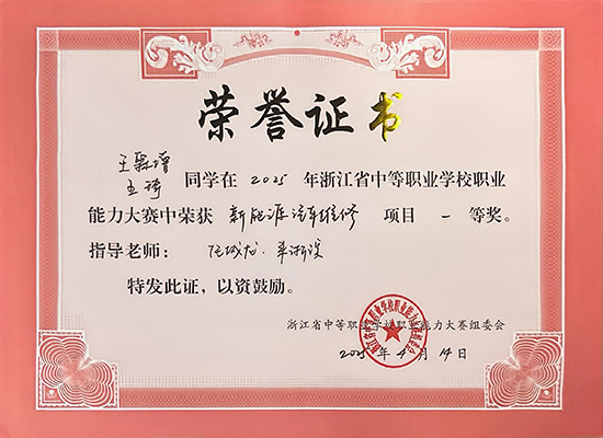 一年一度的浙江省中職學校學生職業(yè)技能大賽由浙江省教育廳主辦,是中職學生在省級層面參加的最高級別的專業(yè)技能大賽。本次新能源汽車維修賽項共有全省11個地市29支隊伍參賽,歷時2天,分新能源汽車簡單故障診斷與排除、電驅(qū)動總成裝調(diào)與檢修、新能源汽車維護與動力蓄電池檢測等三個模塊進行。學校王霖增、王琦團隊在眾多參賽隊伍中脫穎而出,斬獲該賽項一等獎第一名(冠軍)。這也是該項目自2019年以來學校第五次奪得省賽金牌(其中2020、2024年停賽),持續(xù)領(lǐng)跑全省中職學校,展示了學校強大的專業(yè)實力。此外,在本次大賽中學校汽修專業(yè)學生張哲、錢杭哲組成的另一支團隊,獲得汽車維修賽項省二等獎。(許葉鋒)