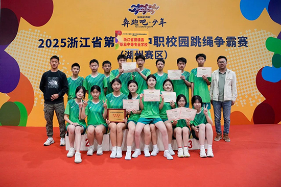 4月21日,在2025年浙江省第三屆中職校園跳繩爭霸賽(湖州賽區)的角逐中,德清職業中專代表隊在校黨委委員馬紀孝的帶領下、黃浙和張富兩位體育教師的專業指導下,16名運動員出色發揮,在女子30秒單搖、10人“8”字跳、8人集體花樣自編表演等8個比賽項目中奪取4項團體第一、2項單項第一,最終以團體總分第一的佳績晉級省賽。運動員們以默契的配合和精湛的技藝,展現了跳繩運動的力與美。