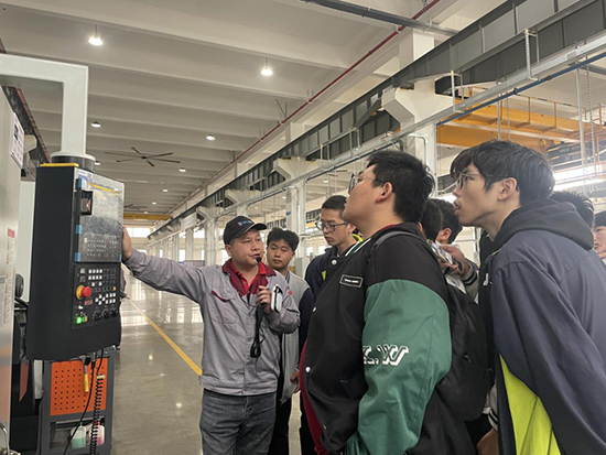 4月24日上午9時,學生們出發前往公司,在公司辦公室主任王意博的引領下,學生們首先參觀了吉沃科技的生產車間。生產線上的工人們熟練地操作著各種高精尖設備,汽車零部件從原材料到成品的每一個生產環節都盡收眼底。來到模具車間cnc工作區域,學生們近距離觀察了工人們如何操作精密的機械設備,大家紛紛感嘆科技企業的生產環境像一個充滿未來感的‘科技實驗室’,并表達了特別想要進入吉沃科技學習cnc數控加工技術的愿望。