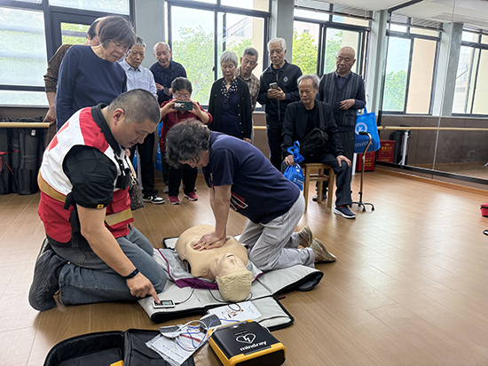 培訓由浙江省一級救護師莫偉風老師主講,莫老師采用了理論和實踐相結合的形式,讓退休教師們初步了解了為什么要學習急救以及現場救護相關的法律問題,并結合典型案例,講解了常見急癥、心臟驟停定義、氣道異物梗阻等,重點演練了心肺復蘇(含AED使用),強調了“黃金四分鐘”的重要性,以及救護成人、兒童和嬰兒的區別。退休教師們對于急救培訓設備都十分感興趣,在莫老師的示范講解下,都積極踴躍地進行了操作練習,初步掌握了胸外按壓、開放氣道、人工呼吸及AED使用等操作要領。