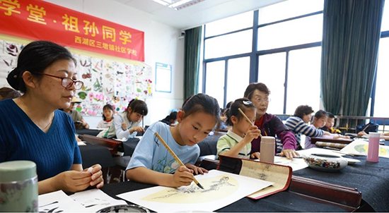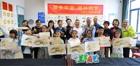 4月29日,杭州市西湖區放春假的一群孩子們相約走進西湖區三墩鎮社區學校,與老年大學堂的爺爺奶奶們一起,學習杭州市非遺項目——扇面藝術。這次活動是該校“銀杏學堂、祖孫同學”公益學習活動的系列主題,目的是通過西湖區優質社區教育資源覆蓋社區,促進代際交流互動,構建全面立體的西湖全民終身教育體系。