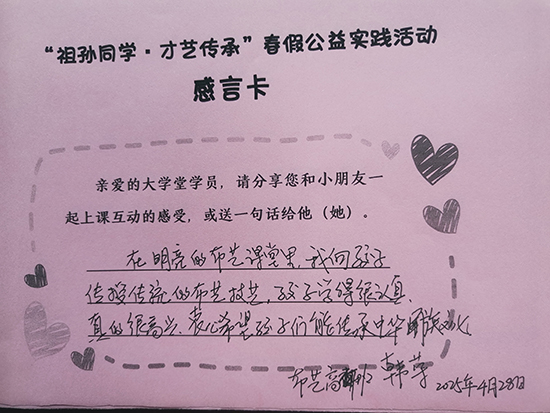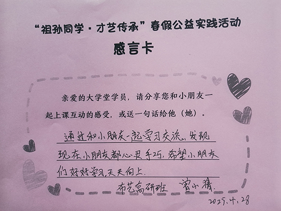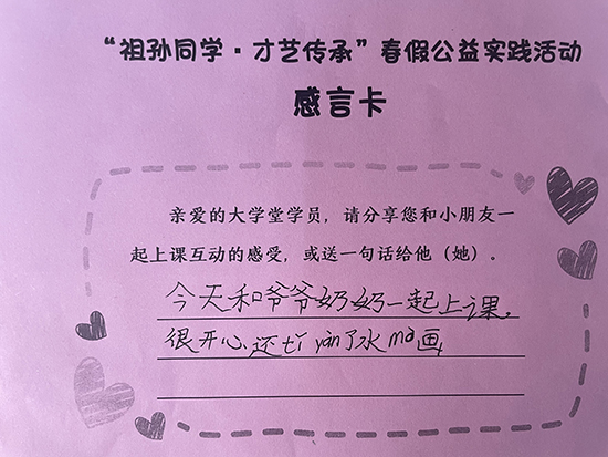 當10后遇見60后,這場代際共學的生動課堂讓兩代人收獲滿滿。“小小體驗官”們表示:“和奶奶成了同學,一起跳舞超有趣,學了很多動作,很快樂!”“爺爺奶奶教會了我很多課堂上學不到的知識,不僅學會了書法技巧,更懂得了做人的道理。”老年學員同樣感慨良多:“和小朋友們一起上課真是一次非常愉快的體驗,孩子們的好奇心和熱情也讓我們變年輕啦。”“現在的小朋友心靈手巧,真是后生可畏!”“特別的假期,有趣的課堂,感恩社區學院能推出這樣的活動!”
