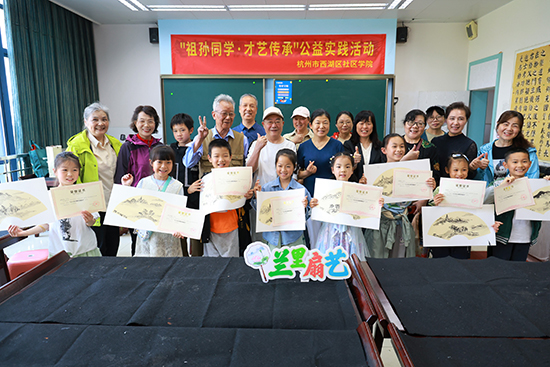 本次活動以“融合”與“互助”為核心理念,精心推出國畫、書法、聲樂、舞蹈、布藝、古箏、手工、英語、走秀等豐富多彩的課程。在三墩鎮社區學校的扇藝課堂上,丁爺爺耐心指導孩子們運筆技巧,從墨色濃淡間感悟中國傳統美學的深厚底蘊;轉塘街道社區學校的合唱教室里,老年學員與孩子們共同演繹歌曲《世界贈予我的》,用歌聲傳遞“以溫柔目光回饋世界”的人生智慧;留下街道社區學校的布藝課上,張奶奶手把手教孩子們縫制小布袋,在一針一線間傳承精益求精的工匠精神。