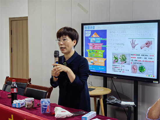 安吉縣人民醫院戴美琴醫師擔任本次講座主講人。她結合多年臨床經驗,以通俗易懂的語言分析了老年人常見慢性病現狀,提醒老年朋友“早發現、早干預”。針對老年人日常飲食,戴醫師提出“少鹽少油、均衡搭配”的膳食建議,并現場傳授“控鹽勺”等實用技巧。此外,她還帶領學員學習簡單易行的八節“拍手操”,鼓勵大家將運動融入生活。