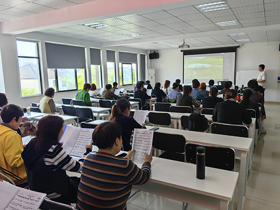 4月30日,在安吉縣社區教育學院靈峰學習中心,一場充滿溫情的音樂之旅悄然展開。歌詠班的學員們在宋雪東老師的帶領下一起唱了以前學習的《永遠的贊歌》等歌曲,沉浸于教唱曲目《想你的時候問月亮》的悠揚旋律之中。