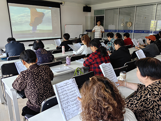 而郞秀珍班長,每次上課總是早早來到學校,她在課堂上也發揮著重要的作用。她積極協助宋老師,安排學員簽到、組織學員們有序就座,發放學習資料。學唱過程中她也以身作則,認真學唱每一個音符,為大家樹立了良好的榜樣。