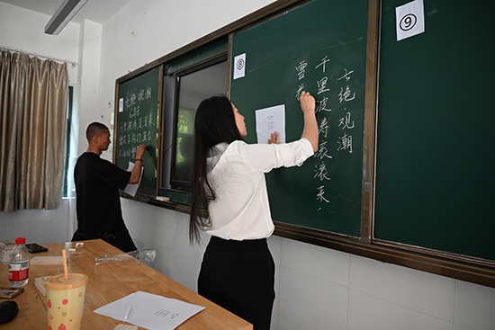 決賽現場,“三字”書寫環節緊張而有序。參賽教師屏息凝神,在各自領域專注完成指定內容的創作。硬筆字跡工整清秀,橫平豎直間透出規范;粉板書布局精巧,鋪展出疏密有致的板書;毛筆作品或遒勁有力或飄逸灑脫,充分彰顯出扎實的書寫功底。不過半小時的時間,一幅幅筆墨生香作品就陸續完成了,引來一群人的圍觀和叫好。