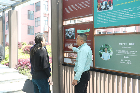 在中央廣場文化長廊,18電子商務班愛心接力照顧“輪椅男生”的感人事跡引起了調研組的特別關注。這一德育案例曾獲“2019感動溫州十大人物(群體)”提名獎,生動詮釋了學校“德技并修”的育人理念。這正是新時代職業教育”立德樹人“根本任務的鮮活實踐。