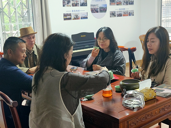 金英美博士一行人參觀走訪了萎凋室、炒茶室、評(píng)茶室等基地的制茶核心功能區(qū)域,詳細(xì)詢問并學(xué)習(xí)竹編茶焙籠、智能控溫炒茶機(jī)等各類制茶器具的工藝原理、操作規(guī)范以及背后承載的文化淵源,對(duì)學(xué)校“一鏈三化”的特色職業(yè)技能培訓(xùn)模式以及取得的產(chǎn)教融合成果表示高度的認(rèn)可。