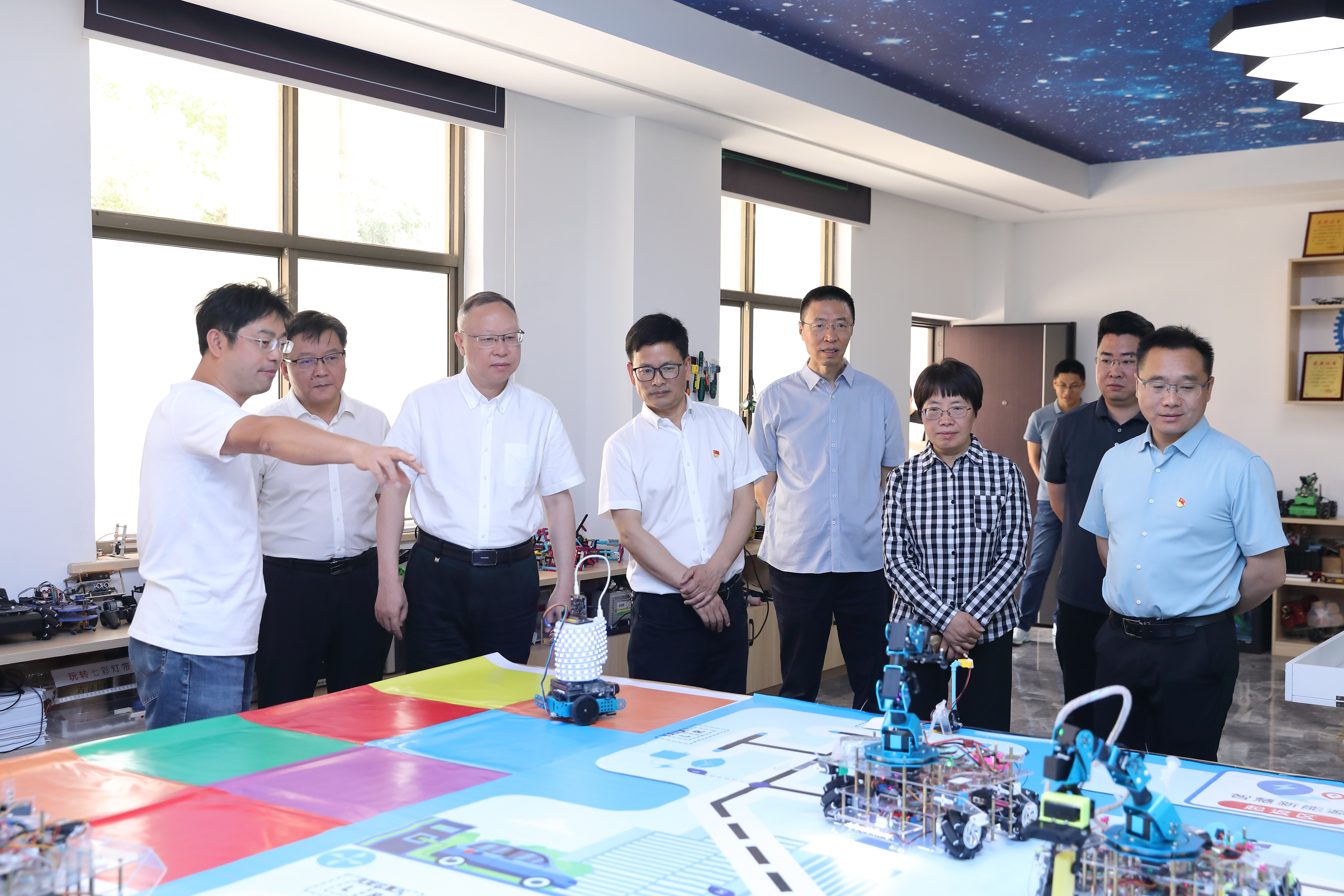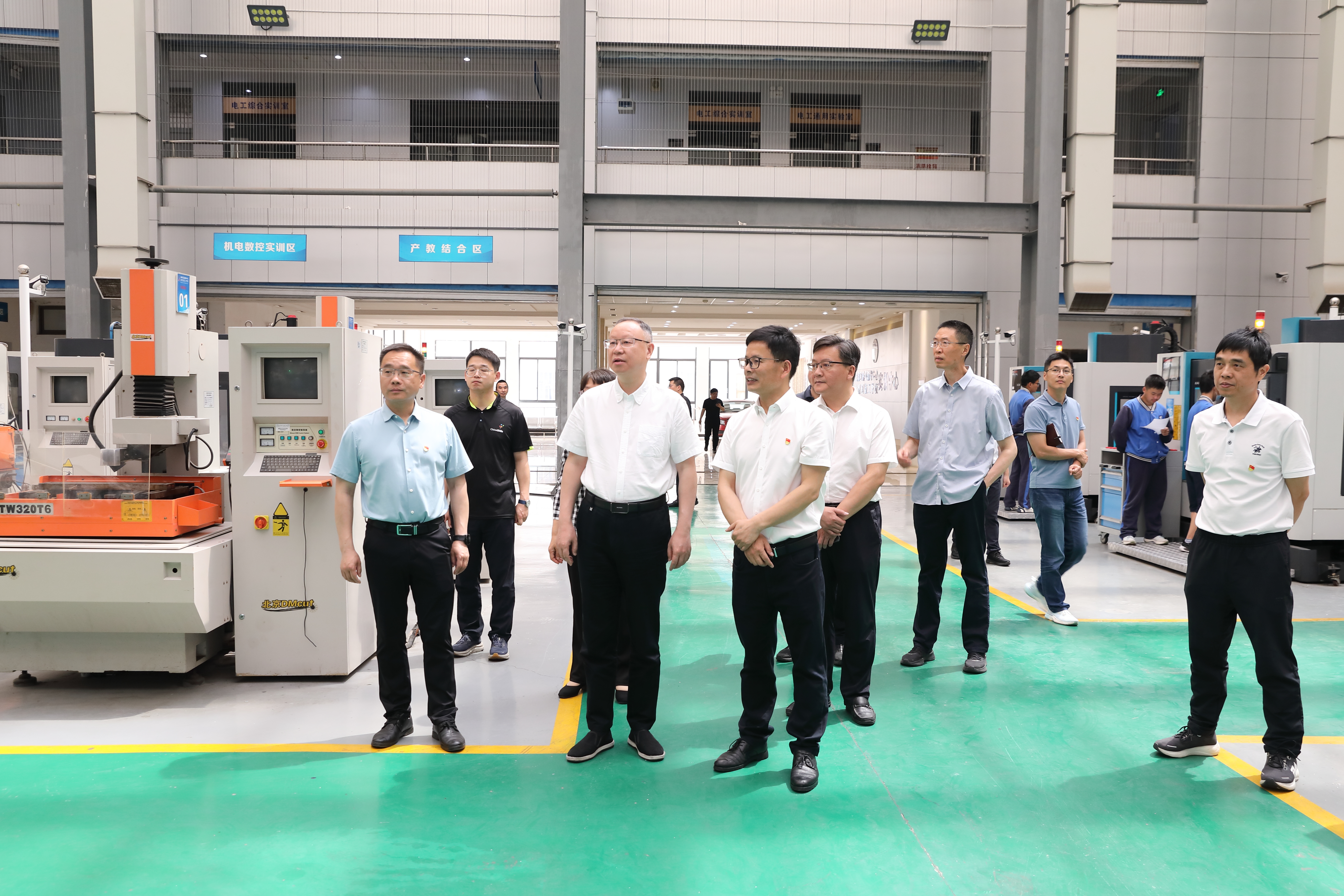 閭小鋒領導一行實地踏看了我校天工智造創客實訓基地、中德SGAVE實訓基地、數控實訓基地和新能源汽修實訓基地等點位。領導們饒有興致地聽取天工智造創客基地負責人、浙江工匠潘曉峰老師的介紹,對一件件自主研發的燃氣爐頗感興趣,當得知燃氣爐已通過企業量產并遠銷海外的時候,領導們都頻頻點贊。在中德SGAVE實訓基地,閭小鋒與全國技術能手任城龍老師親切交談,了解近年來學校在新能源汽修專業領域做大做強乃至全國知名的過程和舉措。