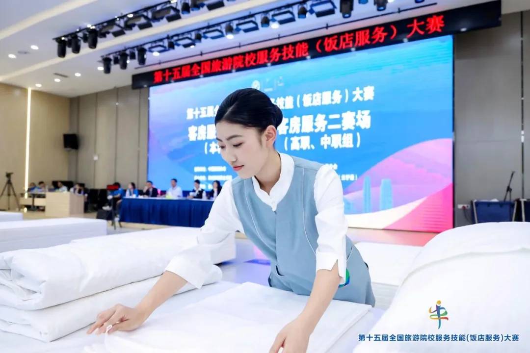 比賽中,學校吳林霖、于佳鑫兩位同學展現了極高的專業水準與職業風采:中餐擺臺精準至毫米級,客房鋪床平整流暢,面對突發狀況沉著應對,贏得評委的高度認可。優異成績源于師生團隊的全力投入,由趙瑩、李月麗、孫葉玲、錢國妹老師組成的指導團隊制定科學訓練計劃,從基本功打磨到實戰模擬層層突破,每一個環節都精心雕琢,付出了大量的時間和精力。