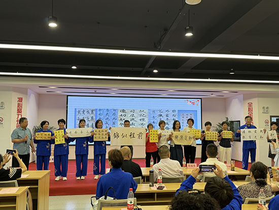 在“藝韻流芳”篇章中,來傳良渾厚的《人生沒有回頭路》唱出歲月沉淀的智慧,健身氣功班學(xué)員以《八段錦》演繹天人合一的東方哲學(xué),而書法班教師孫初亮帶領(lǐng)學(xué)員現(xiàn)場展示作品彰顯翰墨風(fēng)骨,一幅幅遒勁大字如銀鉤鐵畫,筆墨游走處,是老年群體對(duì)傳統(tǒng)文化的守護(hù)與創(chuàng)新。