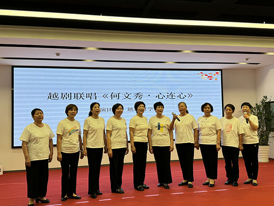壓軸登場的《何文秀·心連心》十人聯(lián)唱,將整場展演推向高潮。學(xué)員們以戲腔唱響“社區(qū)共建心連心”,在百年越劇的婉轉(zhuǎn)旋律中注入新時(shí)代社區(qū)精神。當(dāng)十位銀發(fā)表演者攜手謝幕時(shí),舞臺(tái)仿佛化作跨越時(shí)空的橋梁——一頭連著戲曲博物館里的珍貴戲服,一頭通向智慧社區(qū)里的數(shù)字課堂。