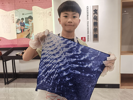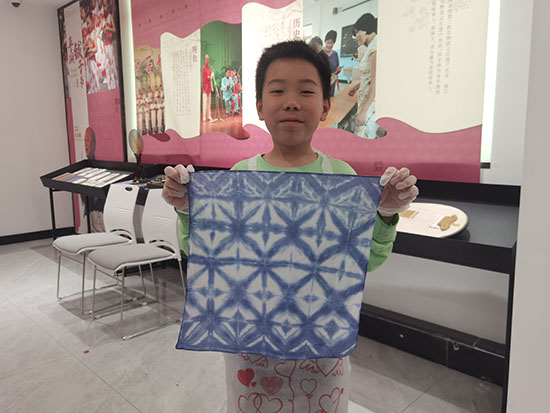 “看,剛提上來的時候是綠色的,現在變成了藍色,就像魔法一樣!”一位孩子興奮地分享著他的發現。隨著作品的晾干和拆線,一幅幅精美的扎染作品逐一呈現在大家眼前,每個家庭都充滿自豪地展示著自己的成果,分享著創作的喜悅和心得。