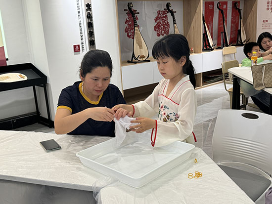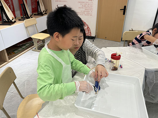 在老師的引導下,孩子們近距離觀察了植物染色成品的紋理和圖案,激發了他們對色彩和染色工藝的濃厚興趣。隨后,孩子們在家長的協助下,動手實踐,運用自己的想象力,創作出獨一無二的扎染作品。