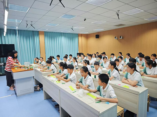 看似小巧的蓮蓬香袋,制作起來卻大有學問。在邵老師的細致指導下,同學們一步步完成創作:先串聯裝飾流蘇,再穿針引線縫制香袋主體。盡管針線活對六年級學生有些挑戰,但邵老師耐心地為每位孩子示范技巧,手把手糾錯指導。隨后,大家裝入清幽的艾草香料,封口收邊,最后用小巧的白珍珠點綴成“蓮子”,一個個精致可愛的蓮蓬香袋便躍然掌心。