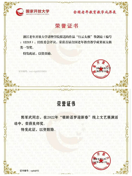 這支平均年齡近70歲的太極隊(duì)伍,以“傳幫帶”的階梯式培養(yǎng)構(gòu)建起可持續(xù)發(fā)展的生態(tài)鏈。老學(xué)員化身助教,新學(xué)員接力傳承,在晨練暮習(xí)中織就縱橫交錯(cuò)的教學(xué)網(wǎng)絡(luò)。當(dāng)太極方陣的颯爽英姿點(diǎn)亮藝術(shù)節(jié)的舞臺,當(dāng)太極團(tuán)隊(duì)及學(xué)員們在國家開放大學(xué)、省、市級武術(shù)比賽中屢屢摘金奪銀,獲獎(jiǎng)證書和獎(jiǎng)牌的背后,不僅是學(xué)員們技藝的精進(jìn),更是一個(gè)個(gè)被武術(shù)滋養(yǎng)的生命在拳風(fēng)劍影中翩翩重綻光華……!