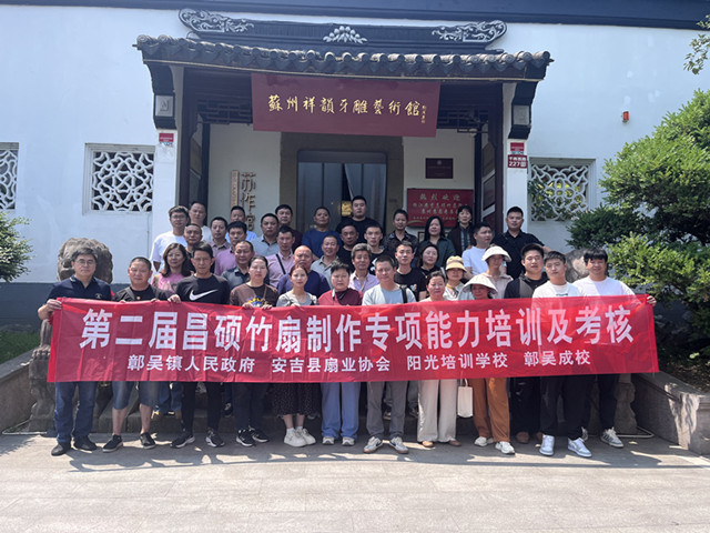 近日,由鄣吳鎮政府、安吉縣扇業協會、鄣吳成校及陽光培訓學校聯合舉辦的第二屆昌碩竹扇制作專項能力培訓圓滿落幕。本次培訓為期32學時,吸引近50名本地制扇工匠參與,通過"理論+實踐+交流"的多元模式,為傳統技藝傳承注入新活力。