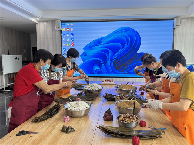新手們也不甘示弱,圍在老手身旁認真學習,雖然動作稍顯笨拙,但在一次次嘗試中,也逐漸掌握了要領,包出的粽子模樣越來越像樣。現場氣氛熱烈,大家一邊包著粽子,一邊嘮著家常,分享著生活中的趣事,不時傳來陣陣爽朗的笑聲,濃濃的節日氛圍彌漫在整個學堂。