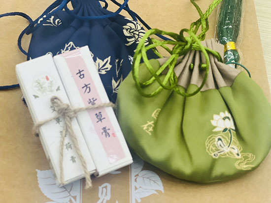 紫草香膏采用傳統配方,溫和滋潤;艾草薄荷膏清涼舒爽,在戶外受蚊蟲頻擾時可快速止癢,舒緩皮膚不適;而中藥香囊則采用五色絲綢材質,內裝艾葉、白芷、丁香等驅避五毒的天然藥材,綴以五色絲線流蘇,寓意祈福安康。香囊清香幽遠,可伴老師們伏案工作,提神醒腦。