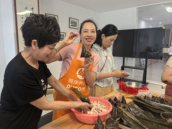 同日,社區聯合居家養老中心開展了包粽子活動,糯米與粽葉在巧手中翻飛成棱角分明的“綠寶塔”。阿姨們看著自己手中的勞動成果,臉上洋溢著幸福的笑容。