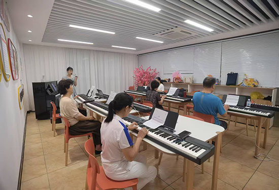 社區老年學堂在前期調研中發現,居民對藝術學習的需求強烈,但普遍存在“無基礎不敢學”“培訓費用高”等顧慮。為此,老年學堂聯合“盛年歡”,量身設計了這套“零基礎入門”公益課程。課程內容從簡譜識讀、手指站位等基礎技能切入,每節課設置“理論講解+實操練習+曲目合奏”環節,確保不同年齡層的學員都能跟上進度。最年長的學員75歲的王阿姨表示:“從沒摸過鋼琴,沒想到真能彈出完整的曲子,老師教得特別耐心!三期課程采用“滾動招生”模式,每期12人小班教學,既保證了教師對學員的個性化指導,又形成了良性的學習氛圍。