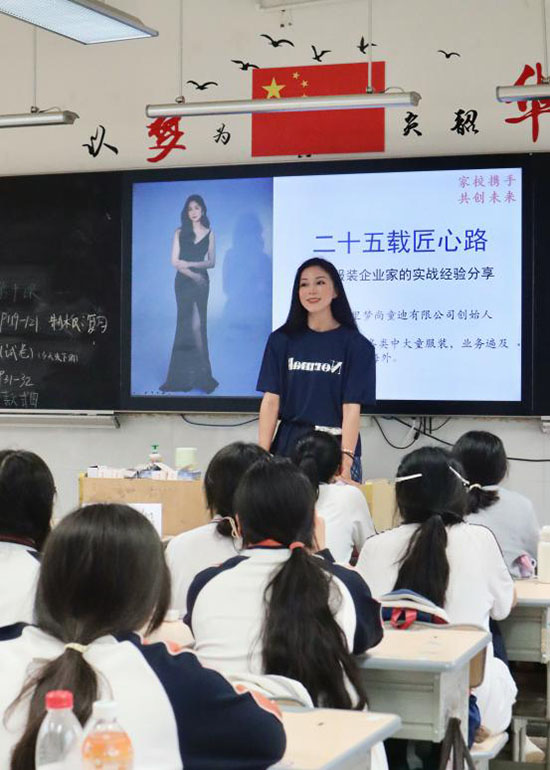 家長介紹,盡管競爭激烈,但服裝行業依然充滿機遇,在織里童裝依舊是熱門賽道,隨著材料技術的發展,織里的服裝產業也在材料上進行著革新。以環保材料、可回收設計等為代表的可持續時尚和高端的智能穿戴市場廣闊,也等待著同學們利用自己的知識和創意創出一片新的天地。