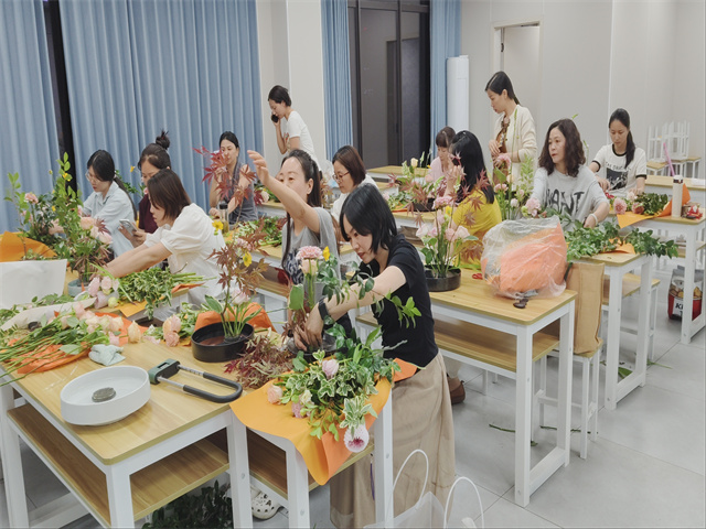 在隨后的實踐操作環節,姚老師親自示范傳統插花的基本技巧和造型設計。她手持花器,靈巧地將花材穿插組合,不一會兒,一個層次分明、意境優美的插花作品便呈現在眾人眼前。學員們紛紛拿起工具和花材,躍躍欲試,在老師的耐心指導下,小心翼翼地進行創作。過程中,大家相互交流心得,分享自己的創意和靈感,遇到困難時,姚老師都會及時上前手把手教學,幫助學員解決問題。