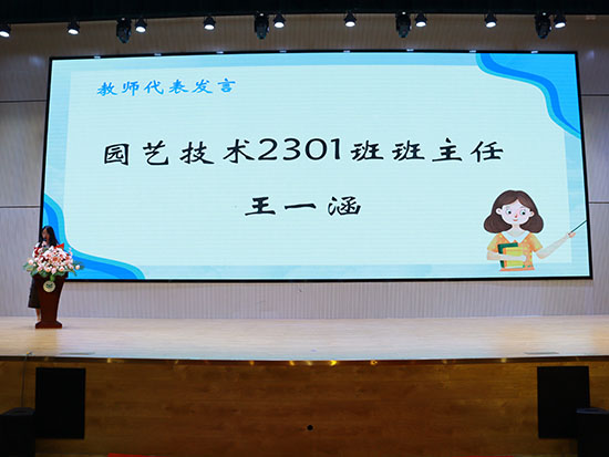 園藝技術2301班班主任王一涵老師代表全體教師發言。王老師深情寄語,勉勵青年“立德修身,勤學篤行”,以真才實學報效祖國。