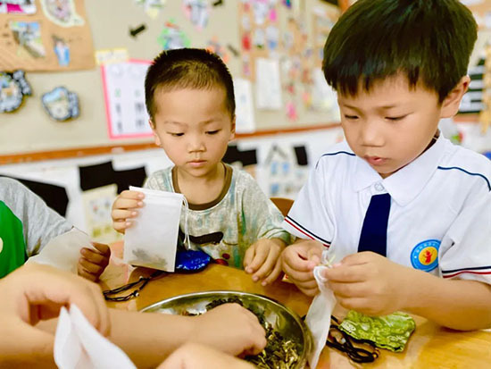 作驅蚊香囊:準備好艾葉、藿香、丁香等10多味中草藥,耐心地按不同份量放入自制的各式香囊袋中,填滿后抽緊繩子,一個香噴噴的香囊就完成了,承載著快樂和健康!