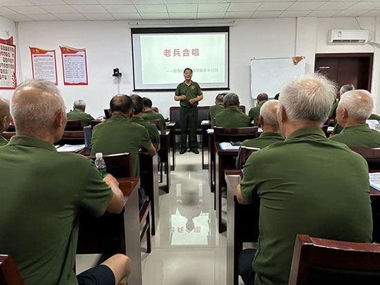 6月18日晚,安吉社區教育學院孝豐分院的歌聲在三眼井社區多媒體教室激蕩起別樣的豪情。31位精神矍鑠的老兵學員身著統一綠色軍裝T恤,如挺拔青松般肅立于椅后,在張鶴鳴教師的指揮下,以一場充滿軍人血性與紀律的合唱排練,重溫崢嶸歲月,唱響赤膽忠誠。課程內容聚焦軍旅經典:復習《咱當兵的人》《小白楊》,并激情學唱《祖國不會忘記》。