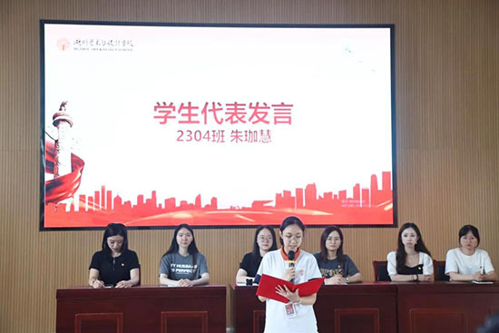典禮在雄壯的國歌聲中拉開帷幕,全場人員肅立,鏗鏘的旋律傳遞著青年團員們赤誠的愛國之心。本期學員代表2304班朱珈慧同學在發(fā)言中倡議,全體新團員要以此為起點,在今后的學習和生活中,以共青團員的標準嚴格要求自己,勇?lián)鷷r代重任。